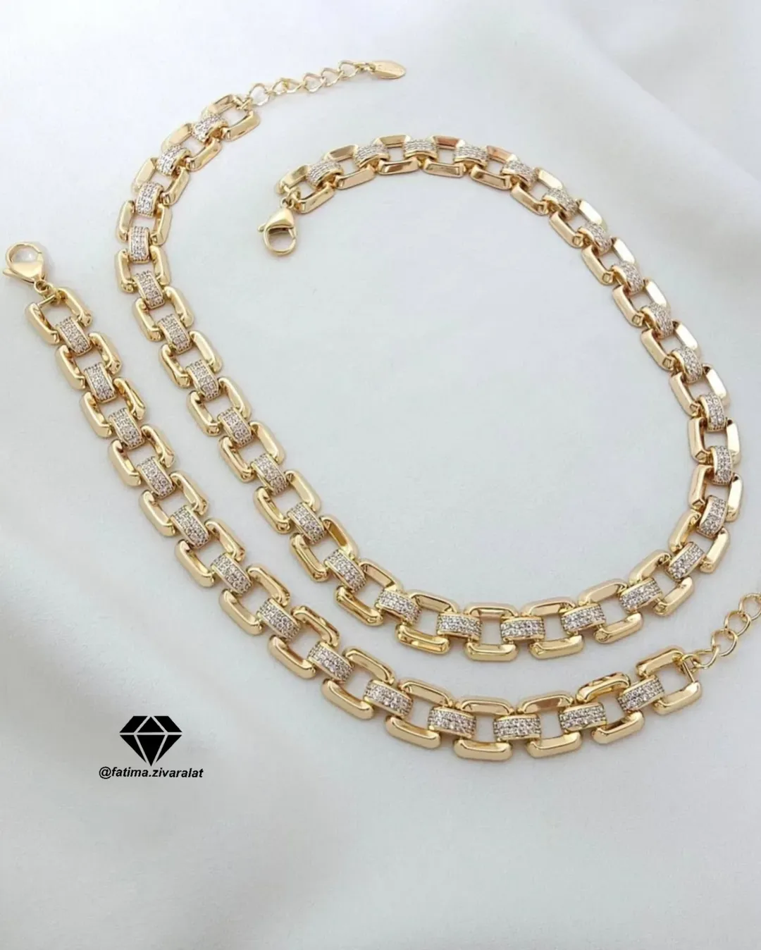 دستهبندی: زیورالاتبرچسبها : ژوپینگست زیورالاتگردنبند ژویپنگدستبند ژوپینگست ژوپینگرنگ: طلایی با آبکاری طلا ۱۸ عیارطول گردنبند: ۴۳طول دستبند: ۲۰